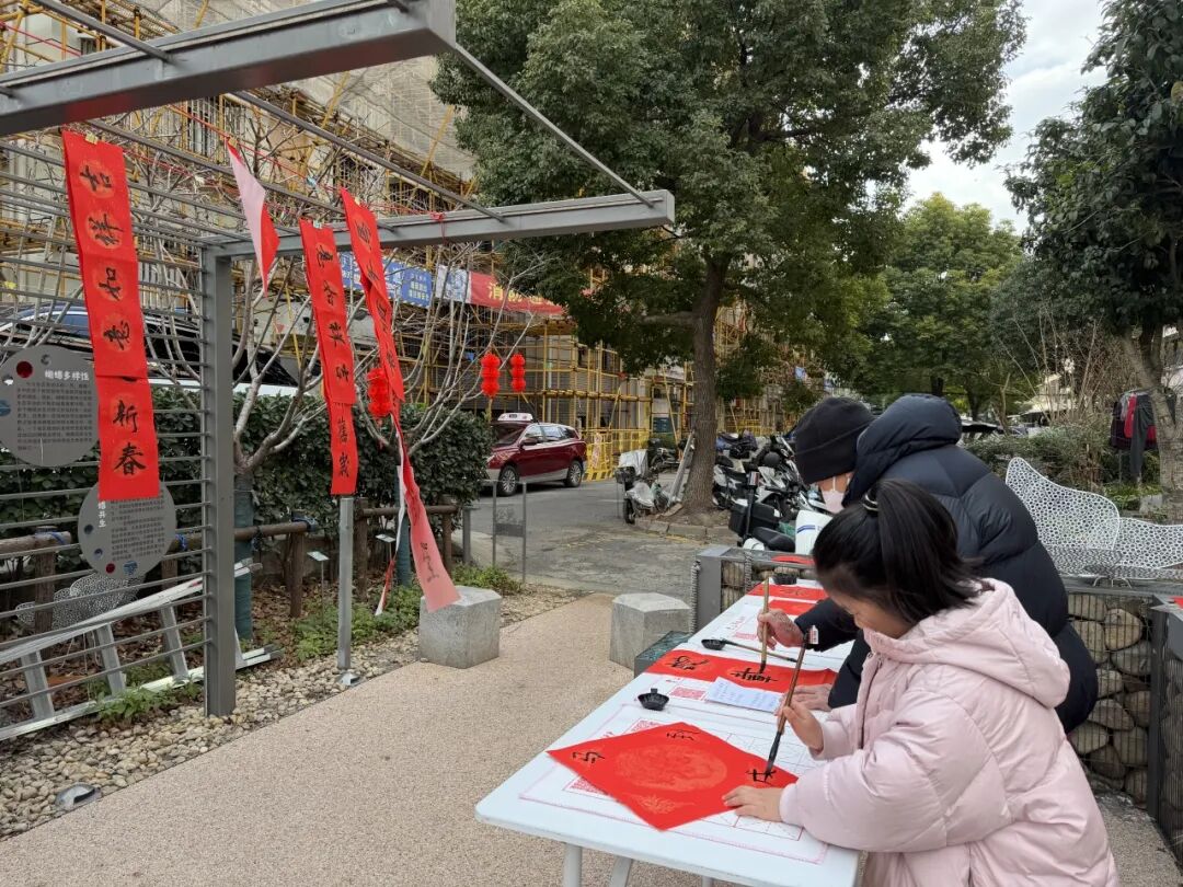 墨香飘荡在生境花园,年味便瞬间浓郁起来。党员志愿者和社区里的书法爱好者现场写春联、写“福”字,一副副红火的春联铺展开来。居民们一边欣赏花园里冬日的景色,一边排队领取这份充满心意的新春礼物,把祝福和花园的美好一同带回家。