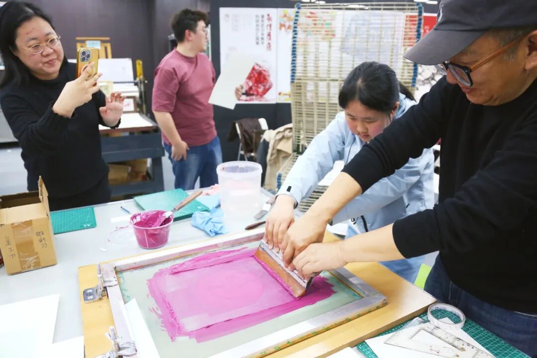本次活动由中国美术家协会会员、上海虹桥半岛版画艺术中心理事邹向群老师主讲,上海市美术家协会会员、虹桥半岛版画艺术中心画师、理事吕笑云老师现场辅导。从制版、上墨到刮印,老师们一步步细致讲解、手把手示范,将丝网版画的完整工艺流程拆解呈现,让零基础的市民爱好者也能快速上手,感受版画创作的独特魅力。