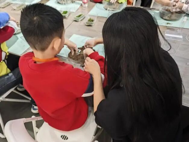 这一环节需要手眼协调、按序操作,对锻炼特殊儿童的精细动作和任务组织能力有帮助。同时,亲子共同完成作品的过程,也增进了家长与孩子之间的默契与情感联结。专注的眼神、灵巧的小手,一座座充满生机的微缩森林在掌心悄然诞生。