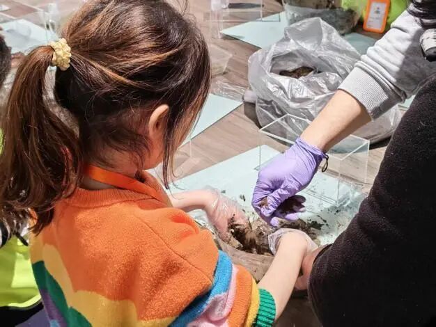 最让人兴奋的是“我的迷你森林”微景观制作。在讲解师示范下,孩子们在家长、社工和志愿者的帮助下,将植物、苔藓、小石子分层放入透明容器,亲手设计属于自己的小小花园。“这是白发藓,毛茸茸的像小动物毛发;这是大灰藓,软软的像小地毯。”孩子们听得入神,小心翼翼铺展苔藓、精心搭配绿色层次。