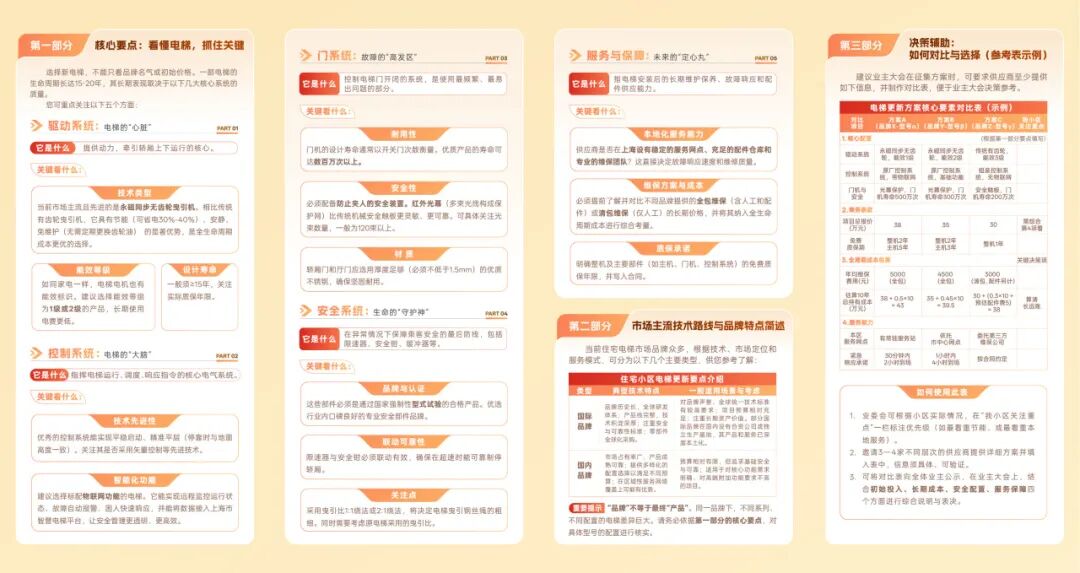 不同于此前针对既有多层住宅的加装电梯指导手册,这本《参考手册》里实用的知识和生动的语言让业主们对“电梯怎么选”这一难题一目了然。“驱动系统:电梯的‘心脏’,它是提供动力、牵引轿厢上下运行的核心。”“控制系统:电梯的‘大脑’,标配物联网功能的电梯,能实现远程监控运行状态、故障自动报警、困人快速响应。”“门系统是使用最频繁、最易出问题的部分,关键看耐用性、安全性和材质。”……在《参考手册》中,除了详细介绍选择电梯的重点,还为业主提供了电梯更新方案核心要素对比表,方便业主决策时参考。