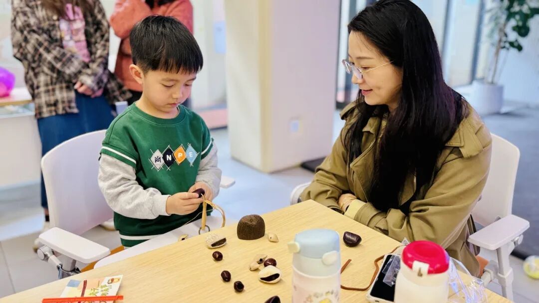 “春日BGM·果壳手摇铃DIY”环节里,手工老师带领大家开启“变废为宝”的创意之旅。松果、核桃壳等常见果壳,在孩子们的巧手下被串联成独具匠心的手摇铃。指尖穿梭间,废弃材料被赋予新生,清脆的铃音里,不仅藏着孩子们对自然的热爱,更传递着零废弃生活理念。