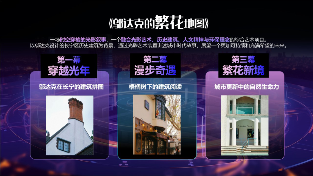 核心看点:带着《邬达克的繁花地图》去探寻长宁阅读城市的光影奇遇秀场。用独特的创意、当代的表达,超越时空的想象,讲述一座城市的人文故事。