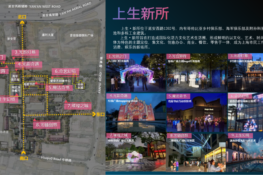 上生·新所的具体布局,以安西路作为主入口,在场地内的不同场景中依次策划了光创之门、光和矩阵、光影奇遇等九大光影新境。