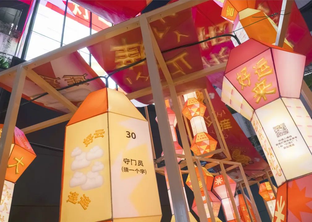上百个灯谜错落其间,灯谜内容爆梗频出,吸引消费者们踊跃参与。“妈妈你看,灯下有谜语。”“守门员猜一个字。”“我知道,是闪!”猜灯谜的互动和趣味也得到了孩子们的喜爱。