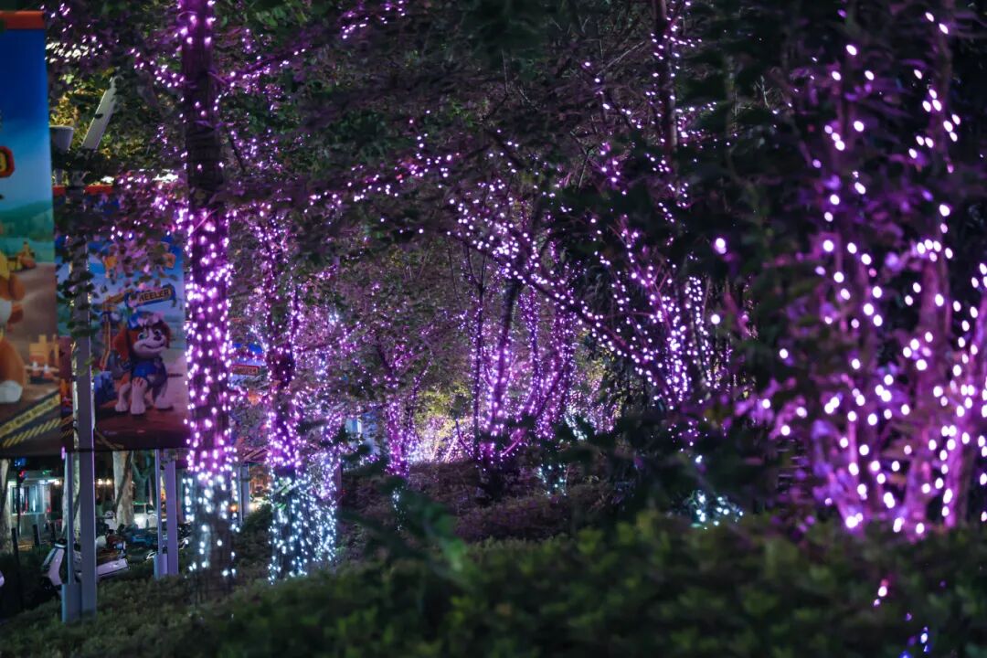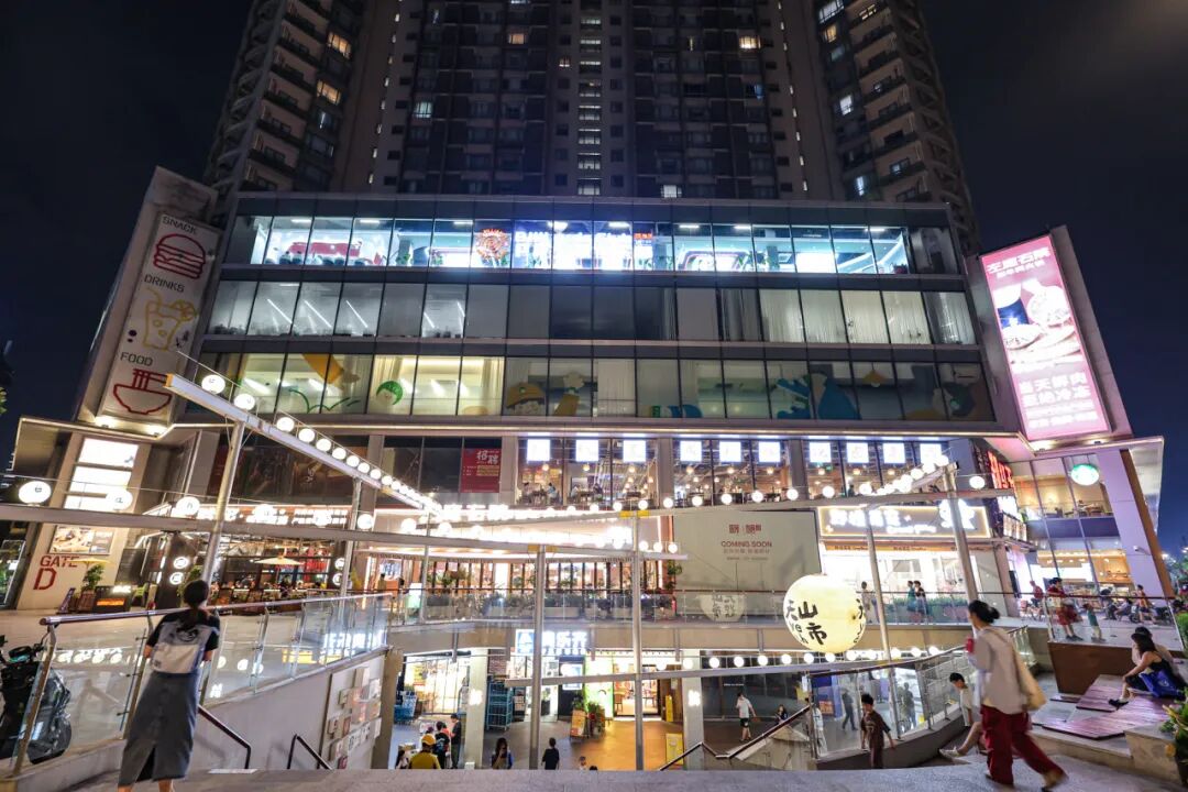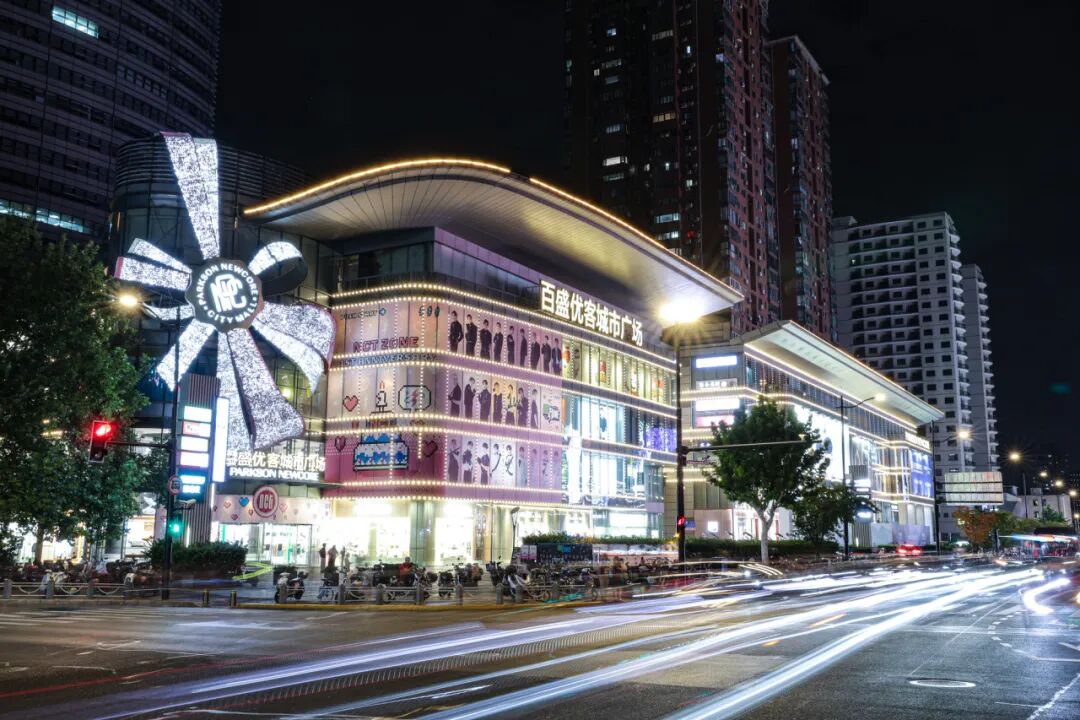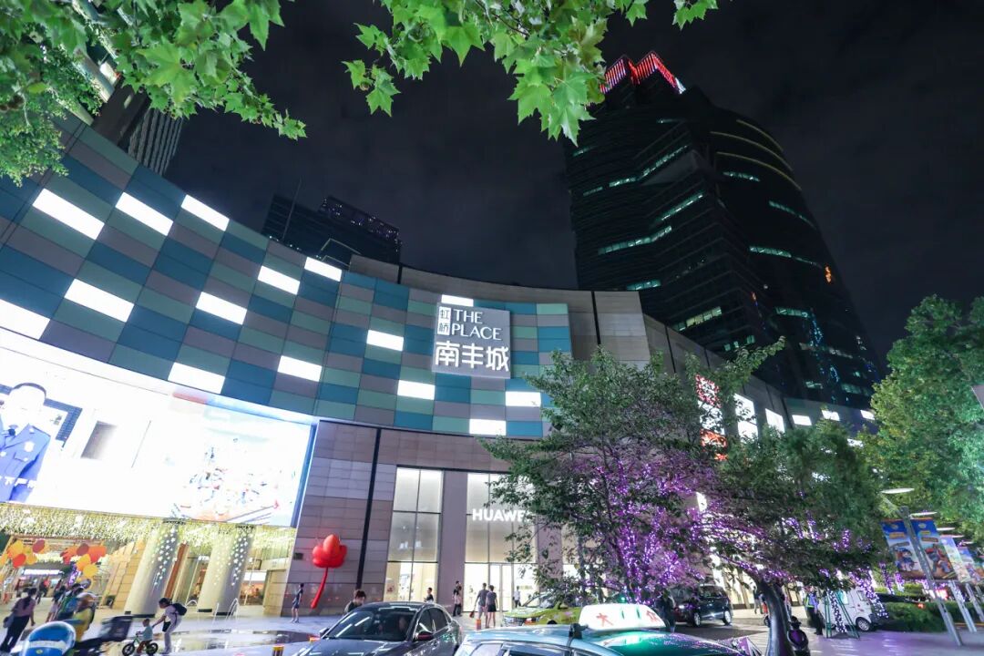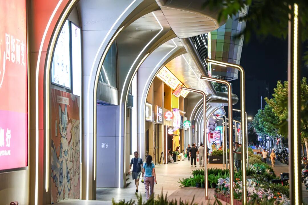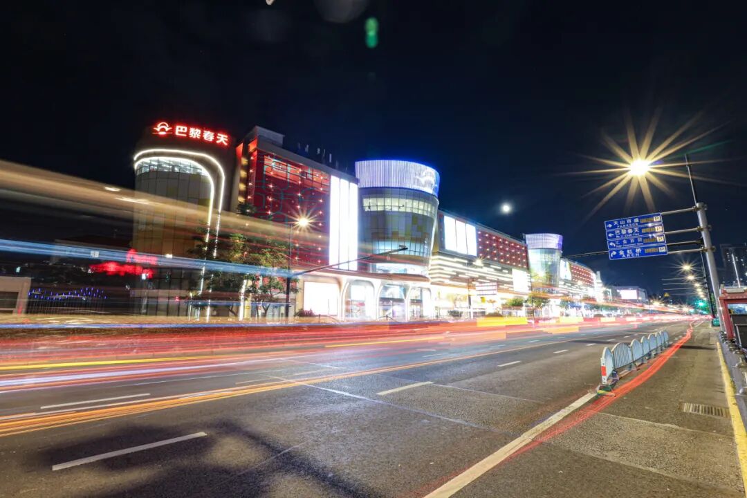 商圈楼宇群率先点亮夜色。尚嘉中心用精准光影勾勒流线型轮廓,冷调光韵尽显高端质感;南丰城以动态灯光呼应商场热闹氛围,灵动色彩延伸至户外;天山百盛、金虹桥、万都中心等楼宇以暖光为基,通过统一色温与亮度协调,共同构筑层次分明的夜间天际线,彰显商圈国际化气质。