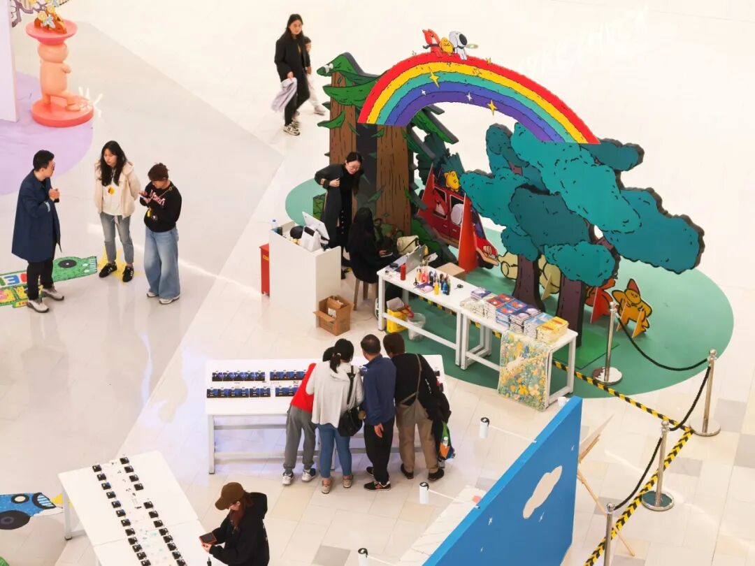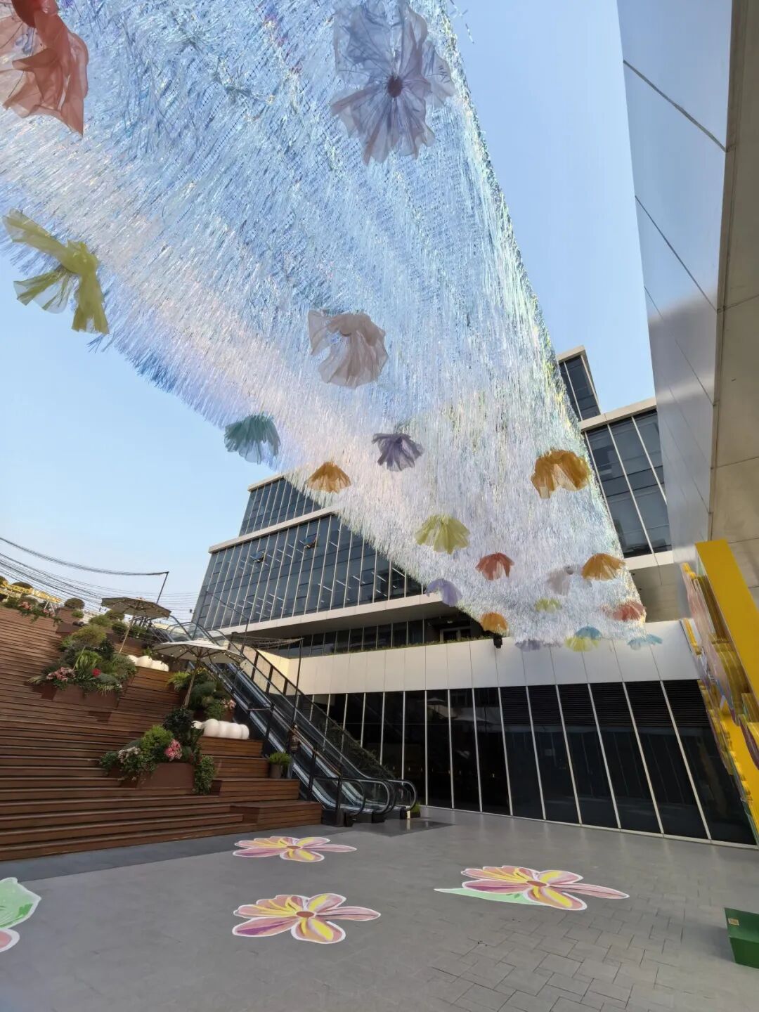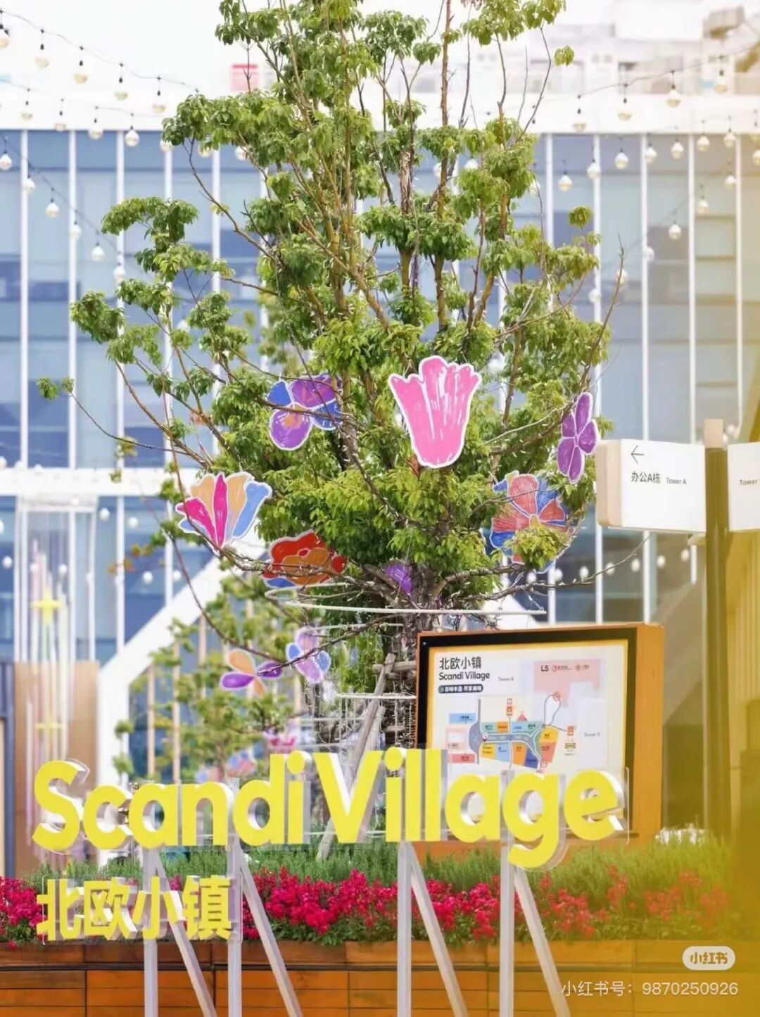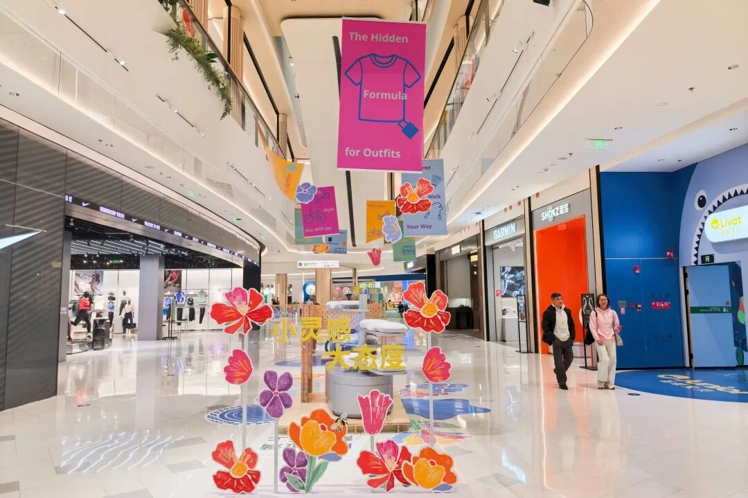 移步场内,悠然荟等公共空间也藏着惊喜,多彩的花艺布景蜿蜒伸展,将北欧风的空间点缀得灵动浪漫。踏入北欧小镇,高处的炫彩流苏在微风中肆意摇曳,每一次摆动都折射出琉璃般的光泽。