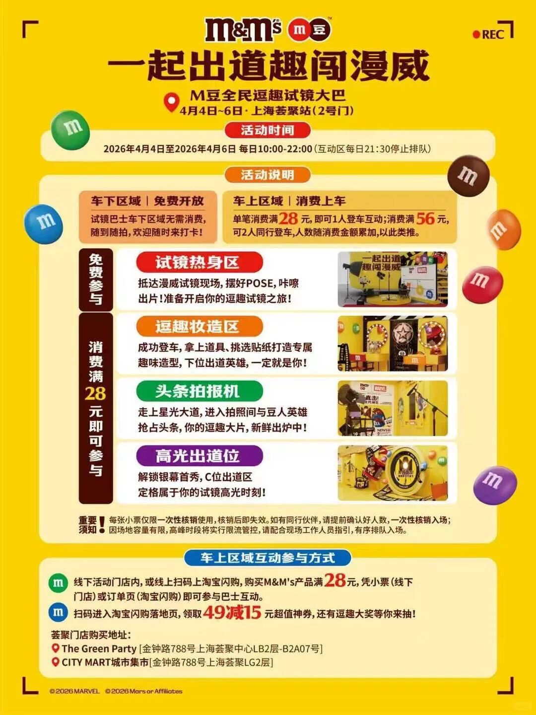 清明假期,更多缤纷玩法在上海荟聚持续上新。4月4日至6日,M豆全民逗趣试镜大巴将空降商场2号门,开启漫威主题互动盛宴。活动设置免费打卡区与沉浸式互动区,涵盖试镜热身、逗趣妆造、头条拍报机、高光出道位等趣味环节,邀请市民沉浸式体验“出道”乐趣。