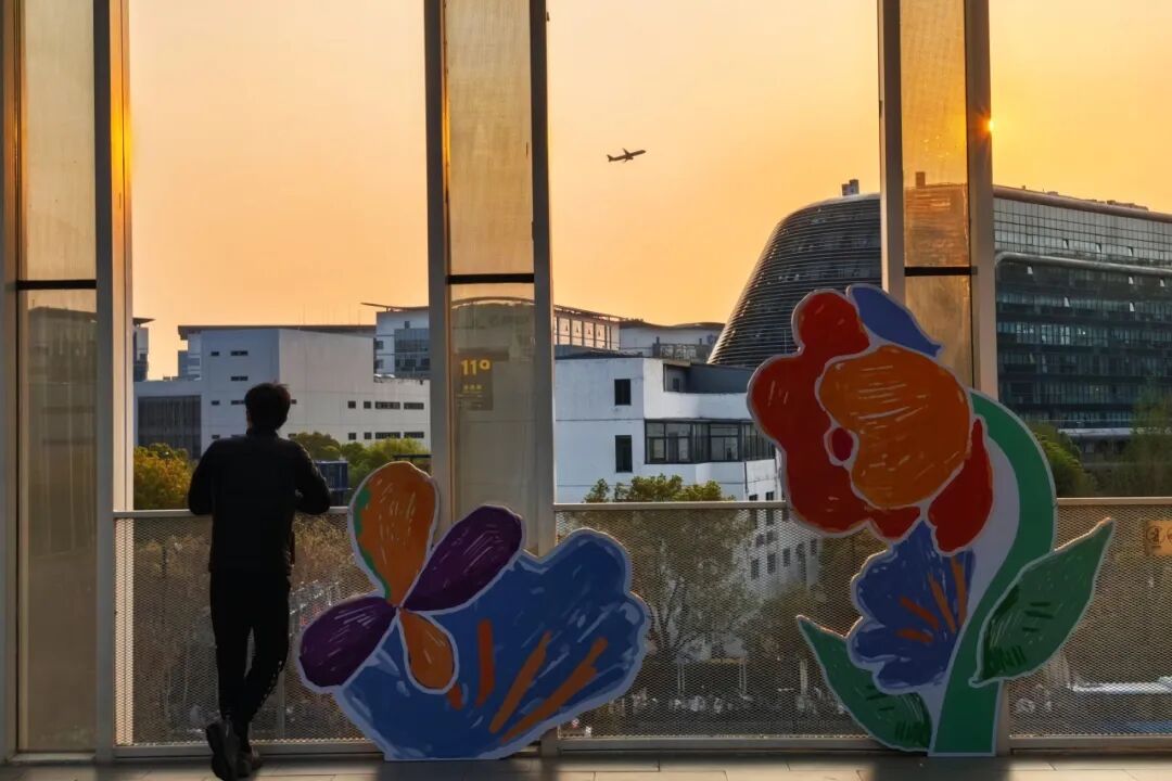 夕阳的余晖缓缓洒下,橙红色的霞光铺满天际,远处的飞机如同飞鸟划破澄澈的天空,临空园区的全景画卷在眼前徐徐展开。一旁的木质阶梯座椅上,不少市民或独自静坐,或三两低语,任时光在惬意中缓缓流淌。