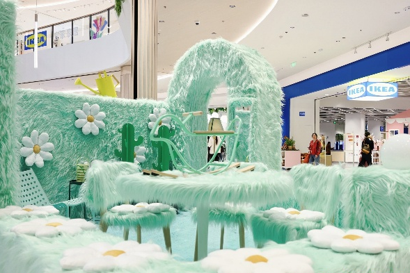 场外,百余盆绿植花卉将休憩座椅团团围住,坐在其中,仿佛被春日的温柔紧紧拥抱。白色树屋宛如童话世界里的城堡,紫色花瀑从屋顶倾泻而下。一旁的粉色滑滑梯在大片绿意的映衬下,如一抹跳跃的春光。宜家网红小猴子雕塑旁,新设的春日花园里,各色花卉争奇斗艳。
