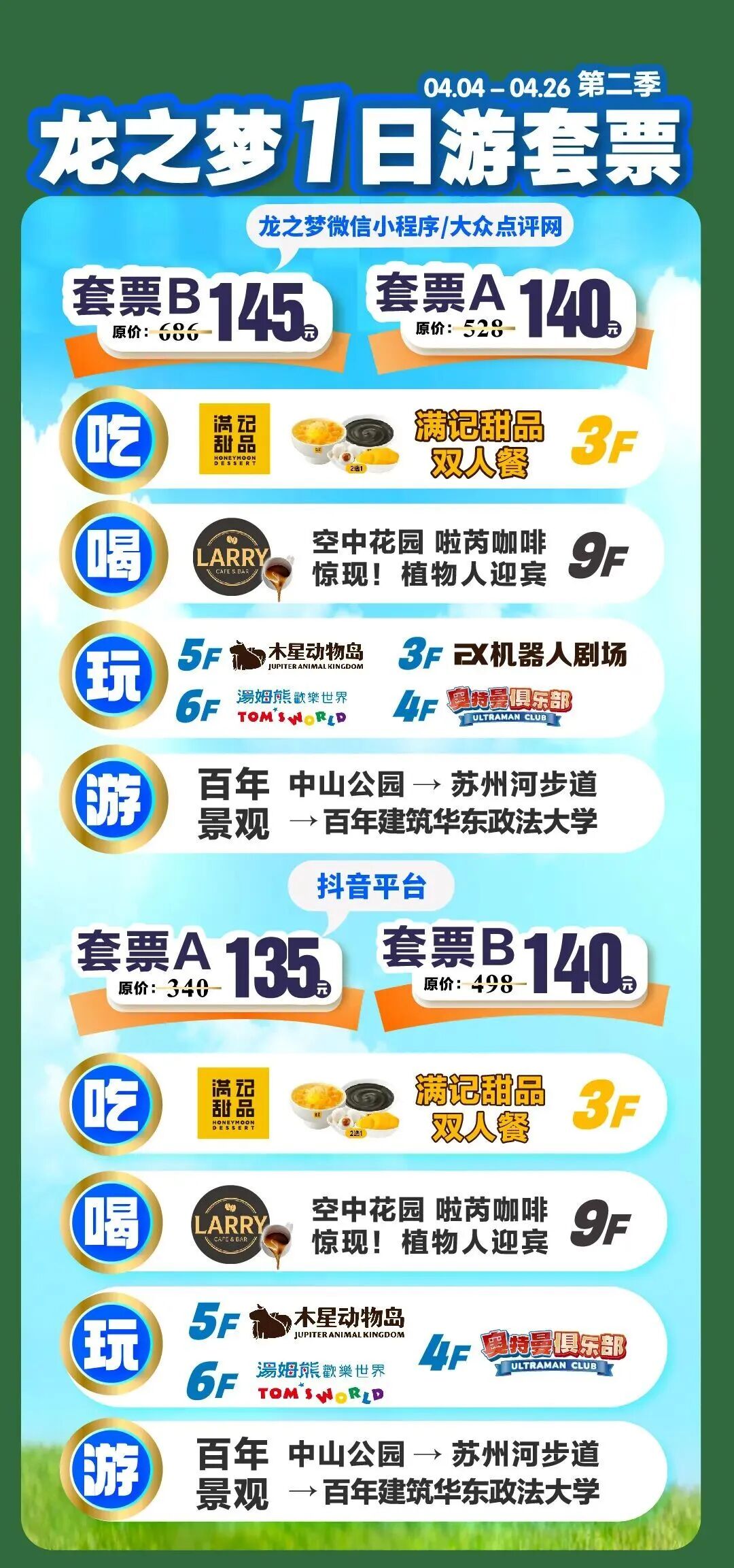 活动介绍:龙之梦1日游套票第二季活动来袭,一站式体验吃喝玩乐游。