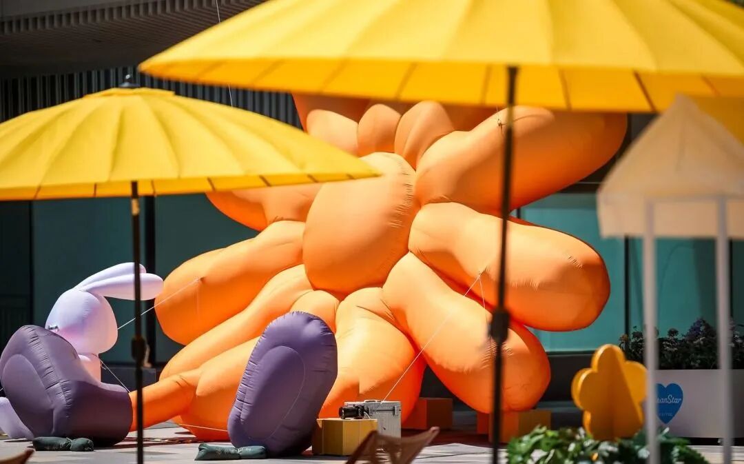亮黄色系的遮阳伞与躺椅、座椅相互映衬,明快色调瞬间点亮空间。造型别致的花朵花坛错落分布,充满活力的绿植为广场增添自然生机。巨型太阳艺术气模矗立其间,传递出活力与温暖。