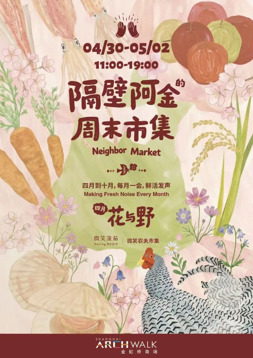 金虹桥商场推出全新自有 IP项目——隔壁阿金的周末市集,以城市治愈系生活聚场为定位,传递可持续、有温度的周末生活方式。首期“花与野”主题市集,集结微笑菠茄、BIO FARM生态农场等可持续品牌,带来手作、食饮、宠物用品等多元品类。