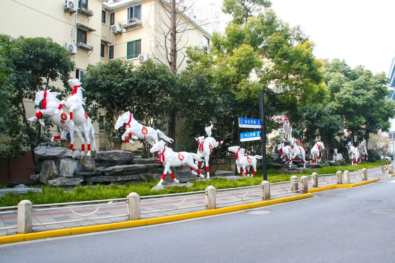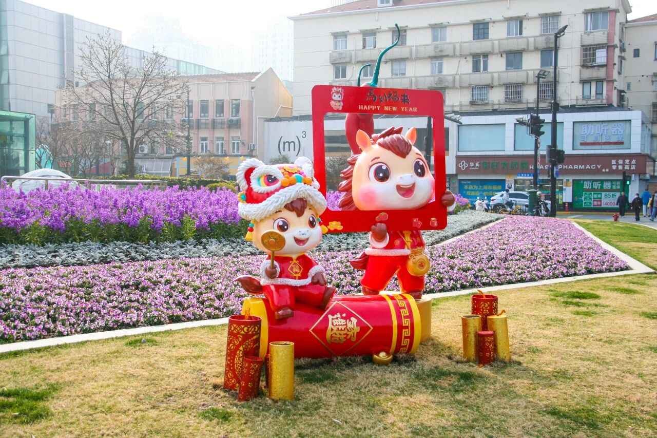 In green spaces near landmarks such as the Wukang Building and in front of the Xijiao State Guesthouse, groups of cartoon horse sculptures draped in red silk and adorned with plum blossom patterns are particularly eye-catching. Their adorable and festive appearance contrasts delightfully with the surrounding seasonal flowers in full bloom and the historic architecture, forming a heartwarming scene where traditional customs and urban life blend seamlessly. This has drawn frequent photos from passersby and tourists.