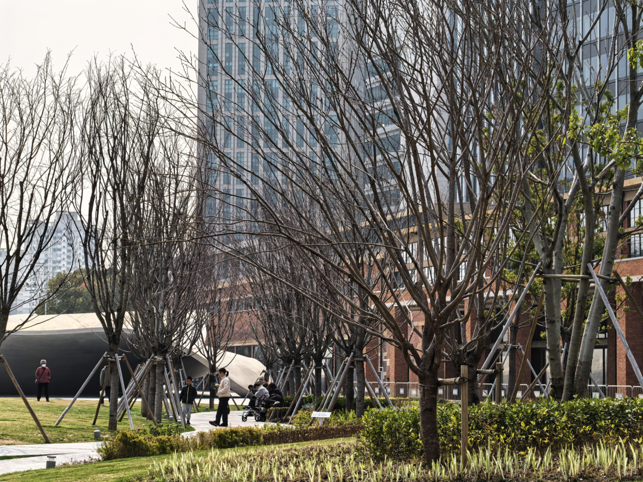 A standout feature of Shanghai A.F.A. is its spatial design concept that embraces the integration of natural elements into its architectural framework. The project adheres to green building standards throughout, with a green coverage rate as high as 22 percent, weaving natural ecosystems seamlessly into the urban landscape. Rows of cherry trees line the main lawn, set to transform into a romantic blossom-lined path when spring arrives, creating an urban natural haven for citizens. Beyond its scenic beauty, the complex also offers thoughtful amenities including resting benches and pet waste bags, reflecting humanistic care.