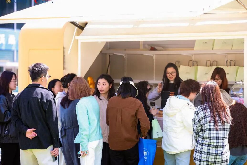 In the outdoor plaza, amid lush greenery, scattered lounge chairs catch the eye. Leave work fatigue behind, sit or lie down, chat with friends under the warm spring sun, and fully enjoy a touch of nature in the city. The pop-up bakery zone of "Chartres Basket" nearby fills the air with tempting aromas – small baguettes, cheese balls, and more – adding a sweet touch to your leisure time.