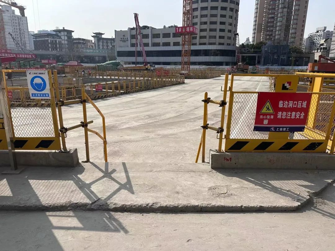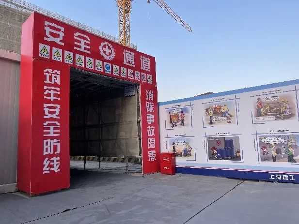 现场设置定型化临电架设,定期进行临电检查和临电验收。现场栈桥及支撑设置定型化围护、支撑围护。设置办公区域安全通道、场地设置定型化钢筋加工棚。工地全域现场设有智能警示牌、限速限载牌。