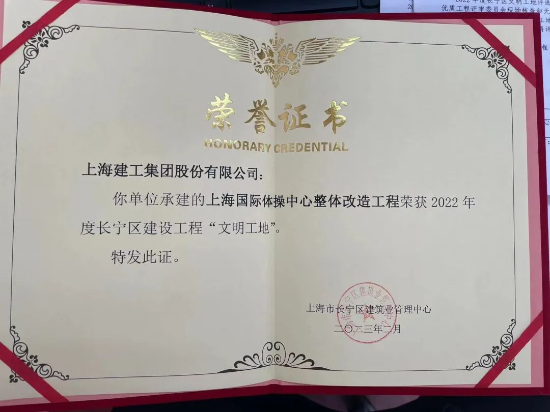近日,上海国际体操中心整体改造项目被评为2022年度长宁区建设工程“文明工地”。
