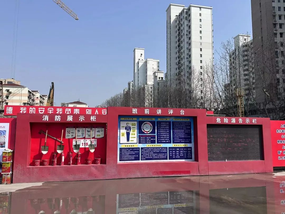 设置标准化、定型化设施,设有讲评台、二级箱防雨棚、危险品仓库、冲洗装置等。现场围墙设有防尘喷淋,靠近居民侧设有隔音屏。