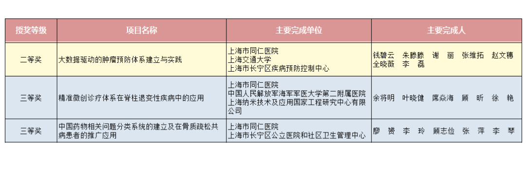 2023年4月19日,上海市医学会举办了2022年度上海医学科技奖一等奖答辩会暨第五届上海医学科技奖奖励委员会第一次全体委员会议,公布了本届上海医学科技奖获奖项目。上海市同仁医院作为第一完成单位共有3项科研成果获奖,分别是虹桥国际医学研究院团队的“大数据驱动的肿瘤预防体系建立与实践”项目荣获二等奖,骨科团队的“精准微创诊疗体系在脊柱退变性疾病中的应用”和药学部团队的“中国药物相关问题分类系统的建立及在骨质疏松共病患者的推广应用”项目荣获三等奖。