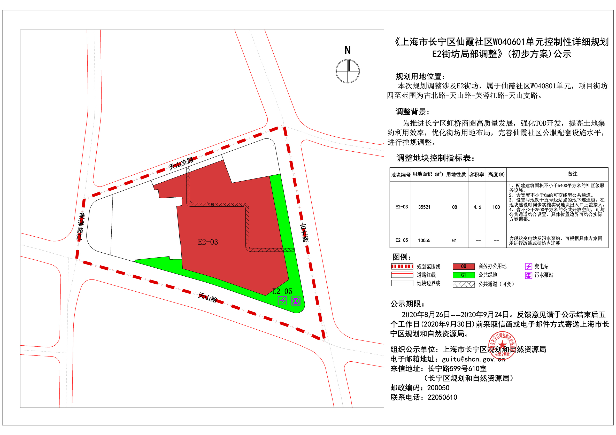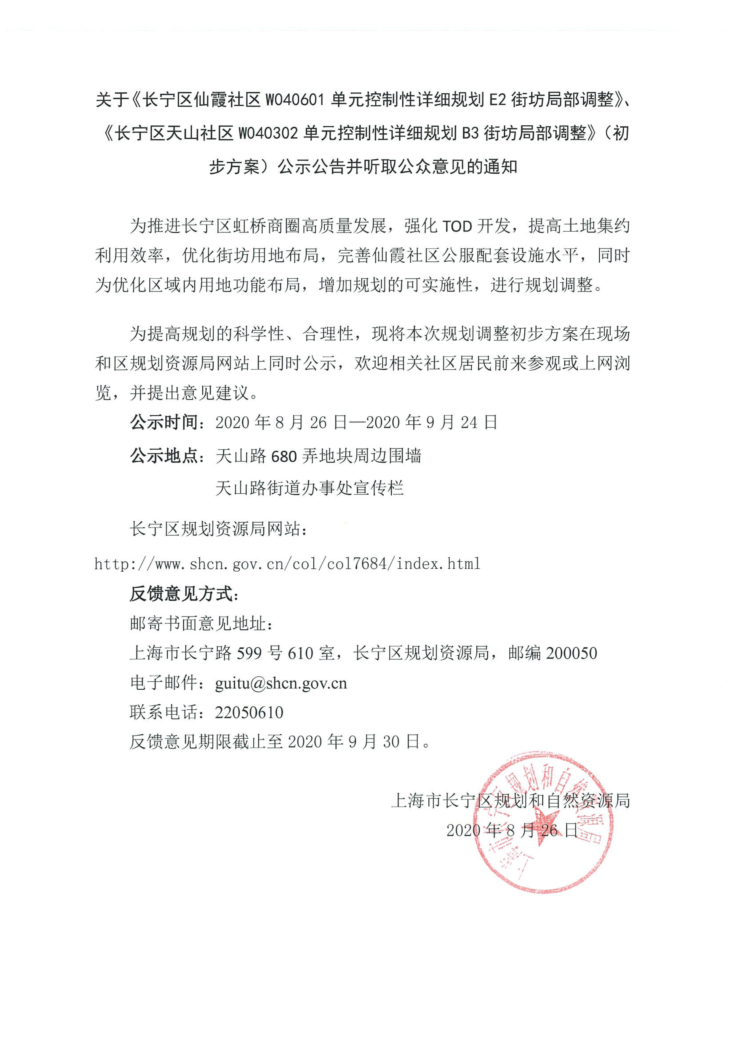 关于《长宁区仙霞社区W040601单元控制性详细规划E2街坊局部调整》、《长宁区天山社区W040302单元控制性详细规划B3街坊局部调整》(初步方案)公示公告并听取公众意见的通知