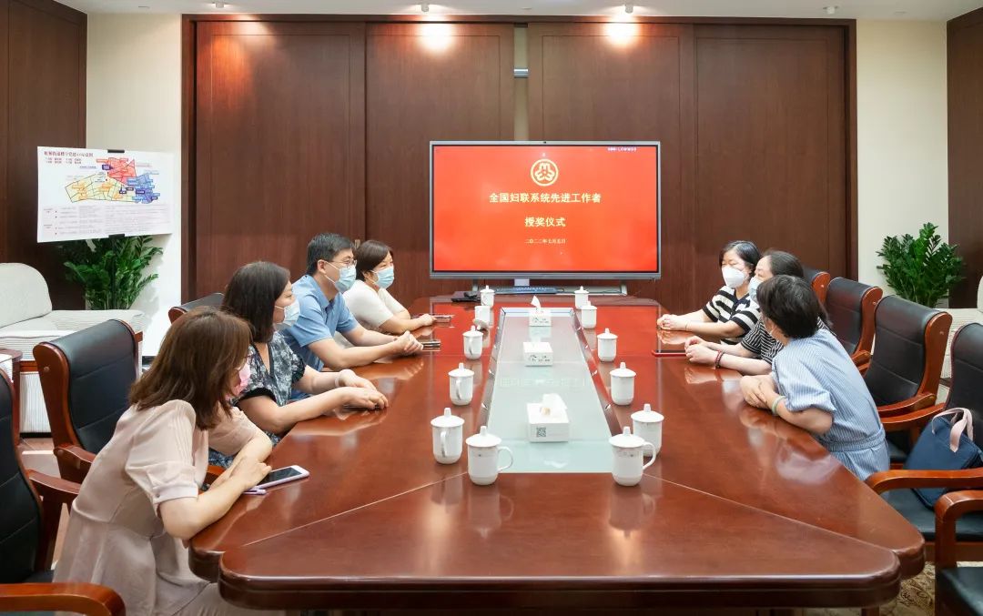 陈建军为虹桥街道原妇联主席章洁颁发“全国妇联系统先进工作者”荣誉证书及奖章;走访了虹桥街道三八红旗手,了解其生活情况,感谢其为区域妇女儿童工作做出的努力和贡献。