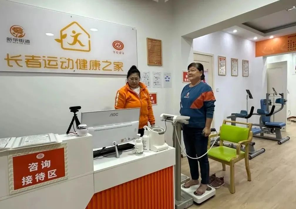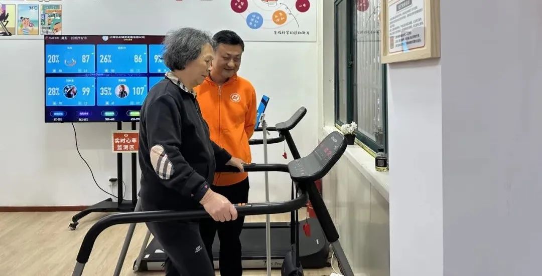 下午3点,在新华居家养老服务中心的长者运动健康之家,居民余奶奶正在专业教练的指导下使用跑步机。与普通健身房的跑步机不同,这台机器不仅运动节奏更舒缓,还可以实时监测使用者的心率,十分适合老年人使用。
